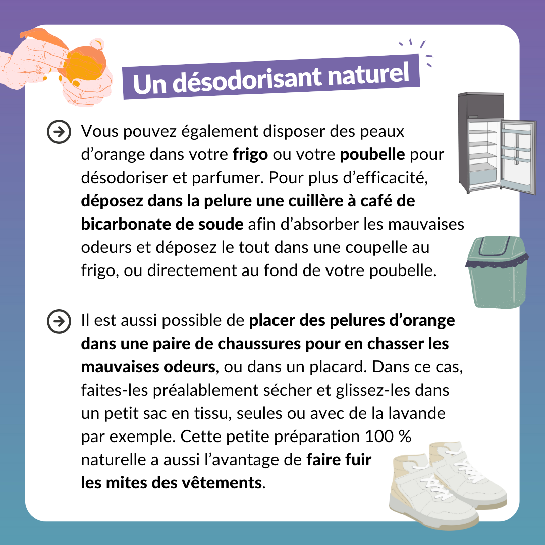 Vous pouvez également disposer des peaux d’orange dans votre frigo ou votre poubelle pour désodoriser et parfumer. Pour plus d’efficacité, déposez dans la pelure une cuillère à café de bicarbonate de soude afin d’absorber les mauvaises odeurs et déposez le tout dans une coupelle au frigo, ou directement au fond de votre poubelle.