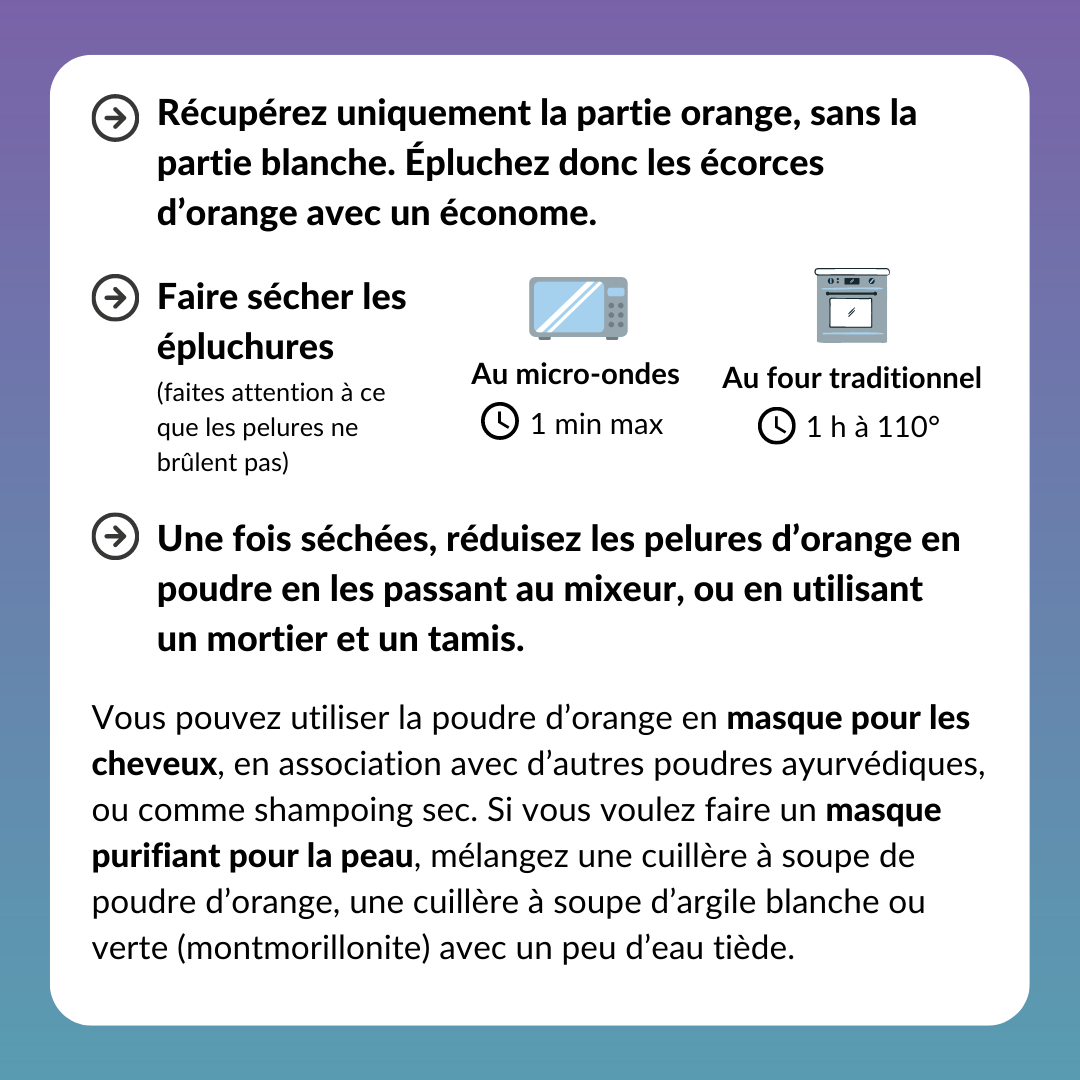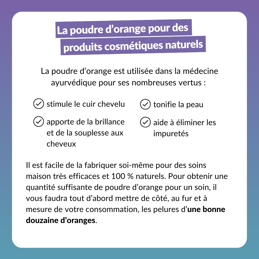 Vous pouvez utiliser la poudre d’orange en masque pour les cheveux, en association avec d’autres poudres ayurvédiques, ou comme shampoing sec. Si vous voulez faire un masque purifiant pour la peau, mélangez une cuillère à soupe de poudre d’orange, une cuillère à soupe d’argile blanche ou verte (montmorillonite) avec un peu d’eau tiède.