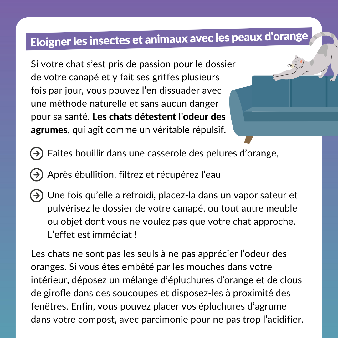 Faites bouillir dans une casserole des pelures d’orange, puis filtrez et récupérez l’eau. Une fois qu’elle a refroidi, placez-la dans un vaporisateur et pulvérisez le dossier de votre canapé, ou tout autre meuble ou objet dont vous ne voulez pas que votre chat approche. L’effet est immédiat !