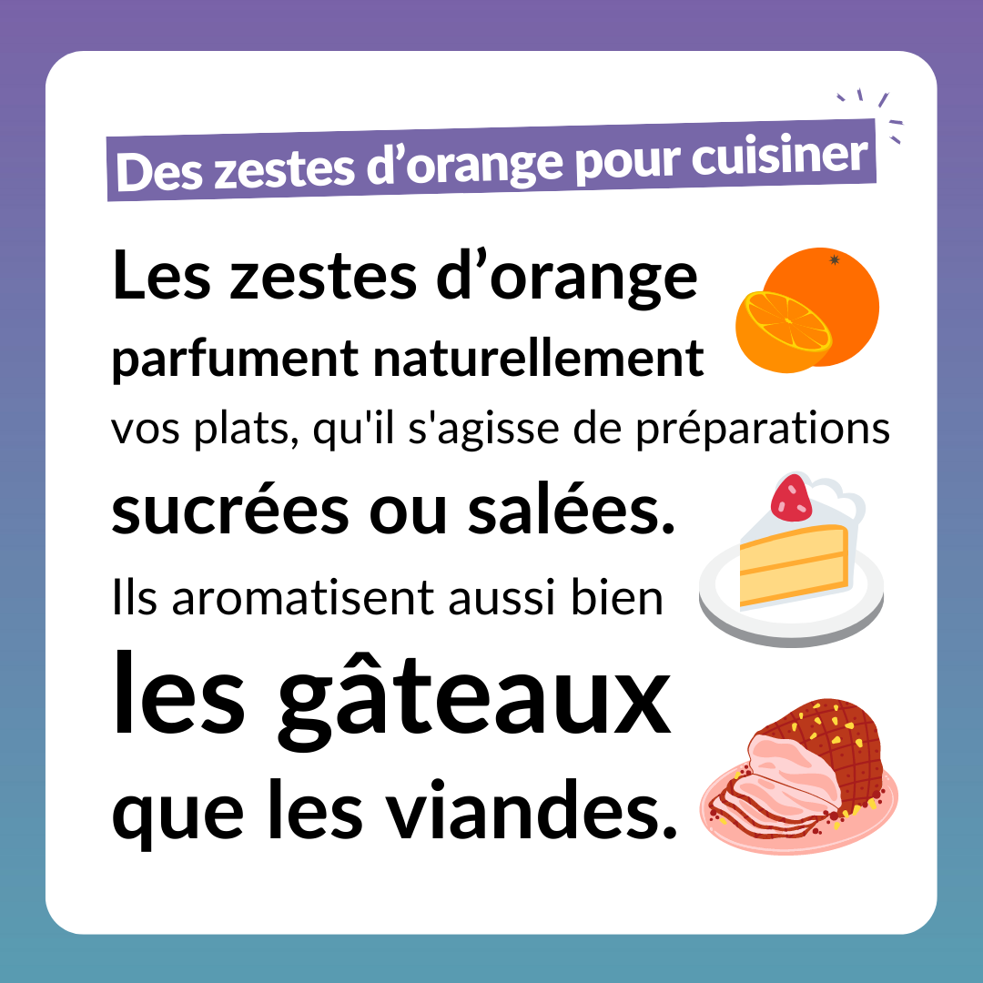 Les zestes d’orange parfument naturellement vos plats, qu’il s’agisse de préparations sucrées ou salées. Ils aromatisent aussi bien les gâteaux que les viandes.