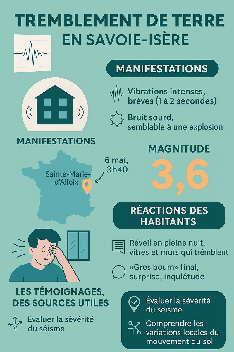 Une nuit agitée entre Isère et Savoie... Ce mardi 6 mai, vers 3h40 du matin, de nombreux habitants des départements de l’Isère et de la Savoie ont été brusquement réveillés. En cause : un tremblement de terre de magnitude 3.6, dont l’épicentre a été localisé à Sainte-Marie-d’Alloix, dans la vallée du Grésivaudan, à quelques kilomètres de Grenoble. Si la secousse n’a heureusement causé ni blessé ni dégât matériel majeur, elle a été fortement ressentie jusqu’à Chambéry, semant l’inquiétude chez les riverains.