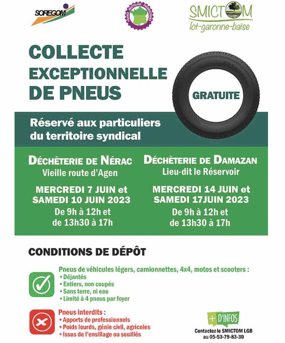 Par ailleurs, le Smictom Lot-Garonne-Baïse (LGB) gestionnaire, organise et une collecte de pneus aux horaires habituels :