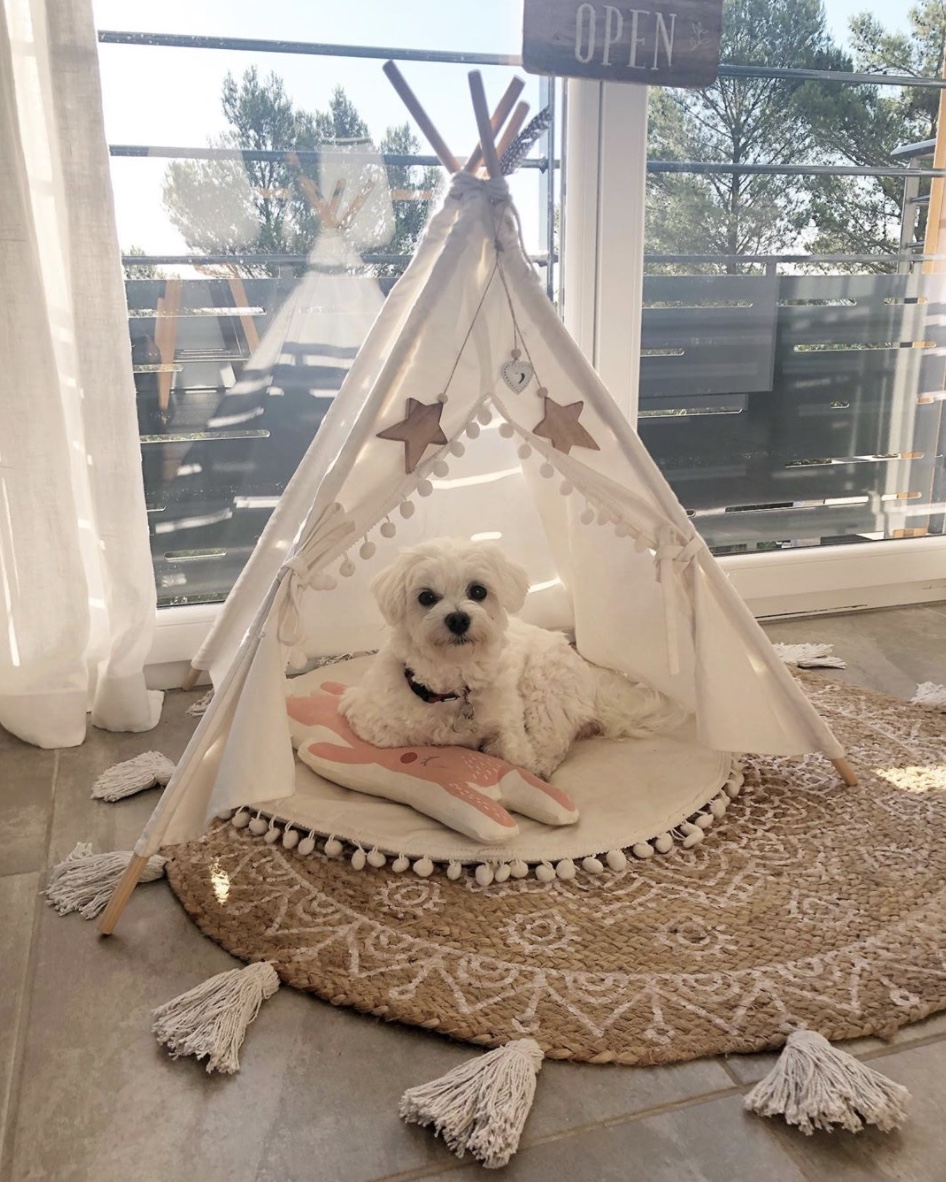 Que diriez-vous d’une petite tente ?! Très tendance, le tipi est déjà adopté dans la chambre des enfants. Il peut aussi se retrouver dans le salon pour accueillir votre fidèle compagnon lors de ses dodos ! Un vieux drap, cinq tuteurs en bois ou en bambou, un peu de colle et le tour est joué ! Glissez un coussin géant dedans et votre chien a sa petite maison dans la vôtre. Retrouvez le joli modèle ci-dessus, sur le compte instagram de ma.jolie_deco.